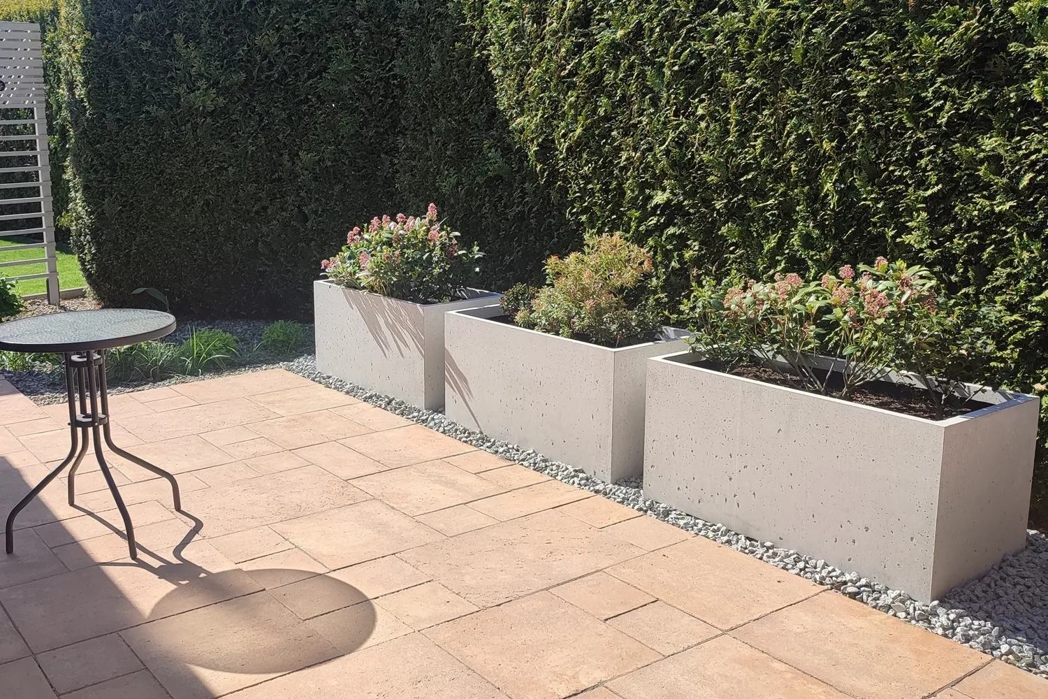 Basso 100×30×40 to niska donica betonowa o wydłużonej formie, doskonała do aranżacji tarasowych i przydomowych ogrodów. Dzięki proporcjom świetnie sprawdza się jako element wzdłuż elewacji lub przegroda wydzielająca przestrzeń.