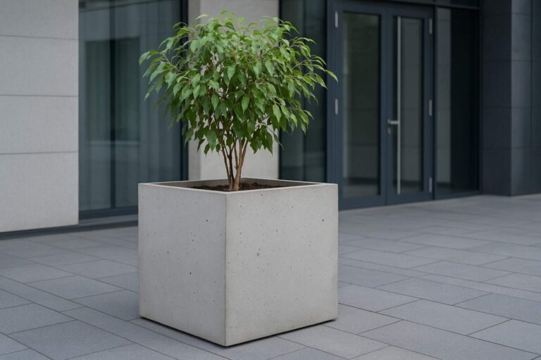 Wykonana z betonu architektonicznego, donica jest odporna na mróz, deszcz i promieniowanie UV. To model chętnie wybierany do ogrodów prywatnych, przestrzeni komercyjnych i miejskich, gdzie liczy się nowoczesny design i trwałość.