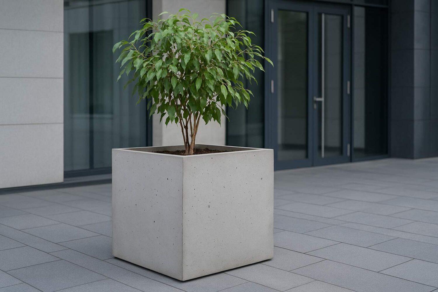 Donica betonowa Cubo 70×70×70 – geometryczny sześcian dla nowoczesnych aranżacji ogrodowych i miejskich.