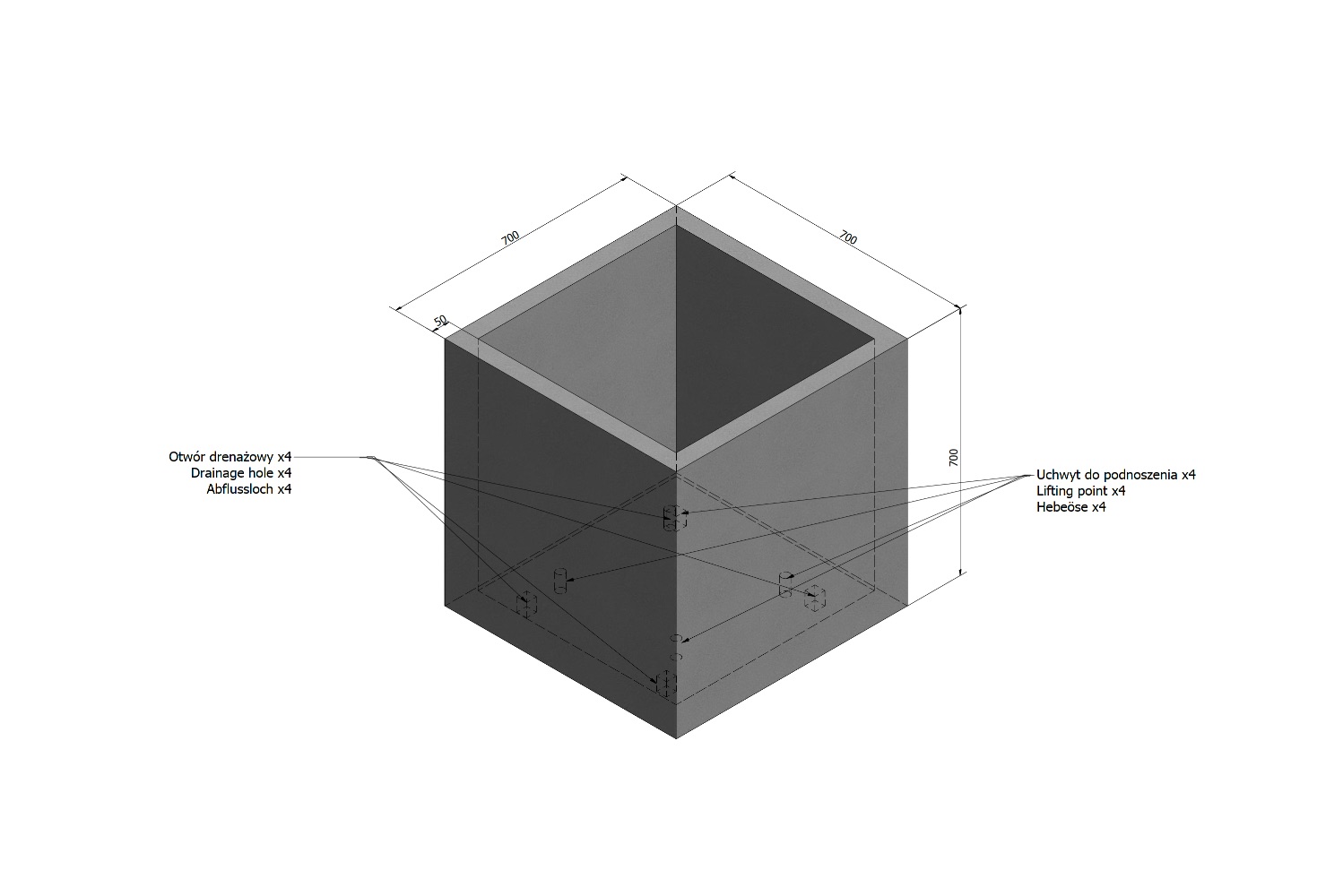 Donica Cubo 70×70×70 to większy sześcian z kolekcji, idealny do tworzenia mocnych akcentów w przestrzeni. Jego proporcje nadają aranżacji stabilności i nowoczesnego charakteru, a duża powierzchnia nasadzeń pozwala na sadzenie krzewów czy grup roślin.